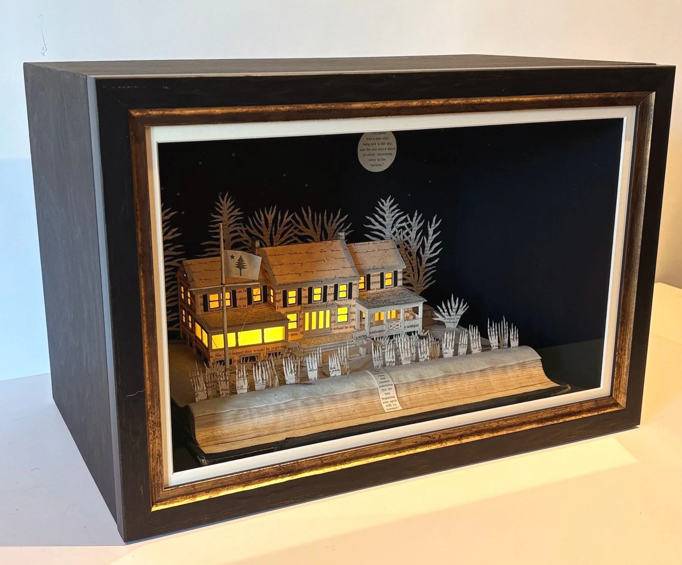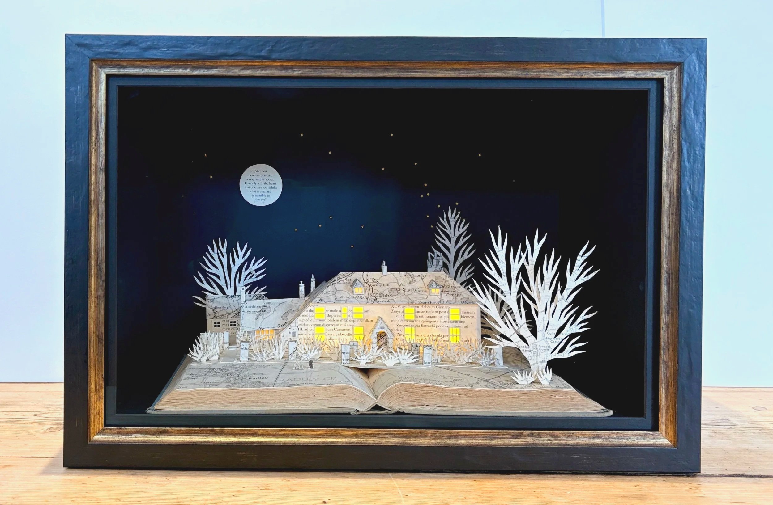 The finished models are then lit from within by tiny, battery powered LED lights and set in deep bespoke box frames, with the switch accessible on the side of the frame, so they can be turned on and off when sat on a book shelf or console.